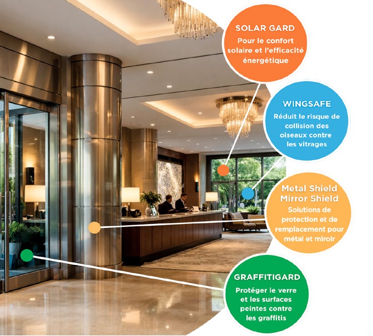 Au-delà du contrôle solaire, Solar Gard Saint-Gobain propose des films destinés à protéger les vitrages, miroirs et éléments métalliques présents dans les hôtels.